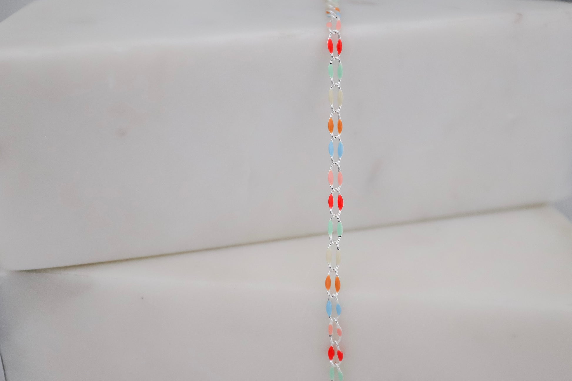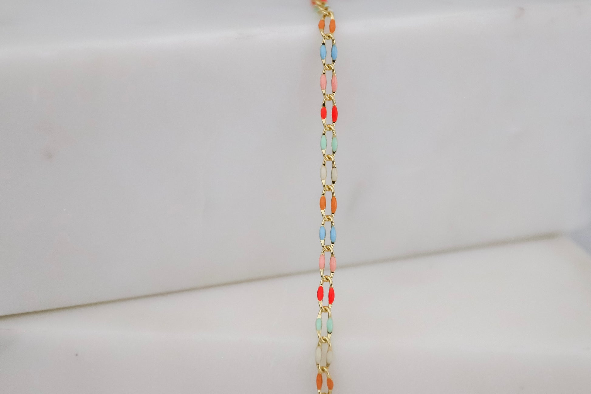 The Beach Babe enamel chain features playful, tropical-inspired colors on a gold/silver plated base. Sold by the foot, it’s perfect for summer jewelry designs like bracelets, anklets, or layered necklaces. Lightweight and flexible, it adds a pop of fun to any custom piece.