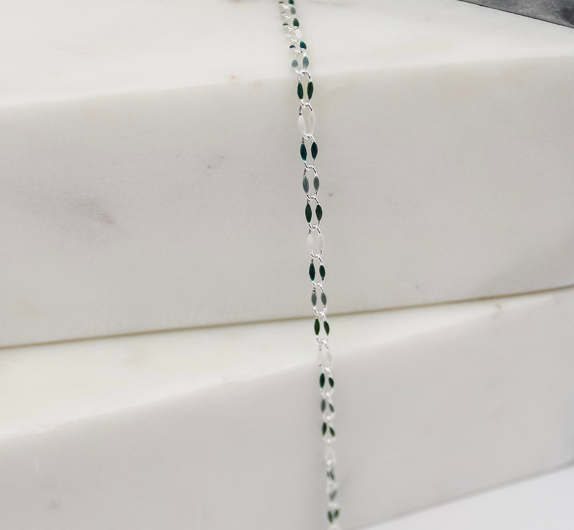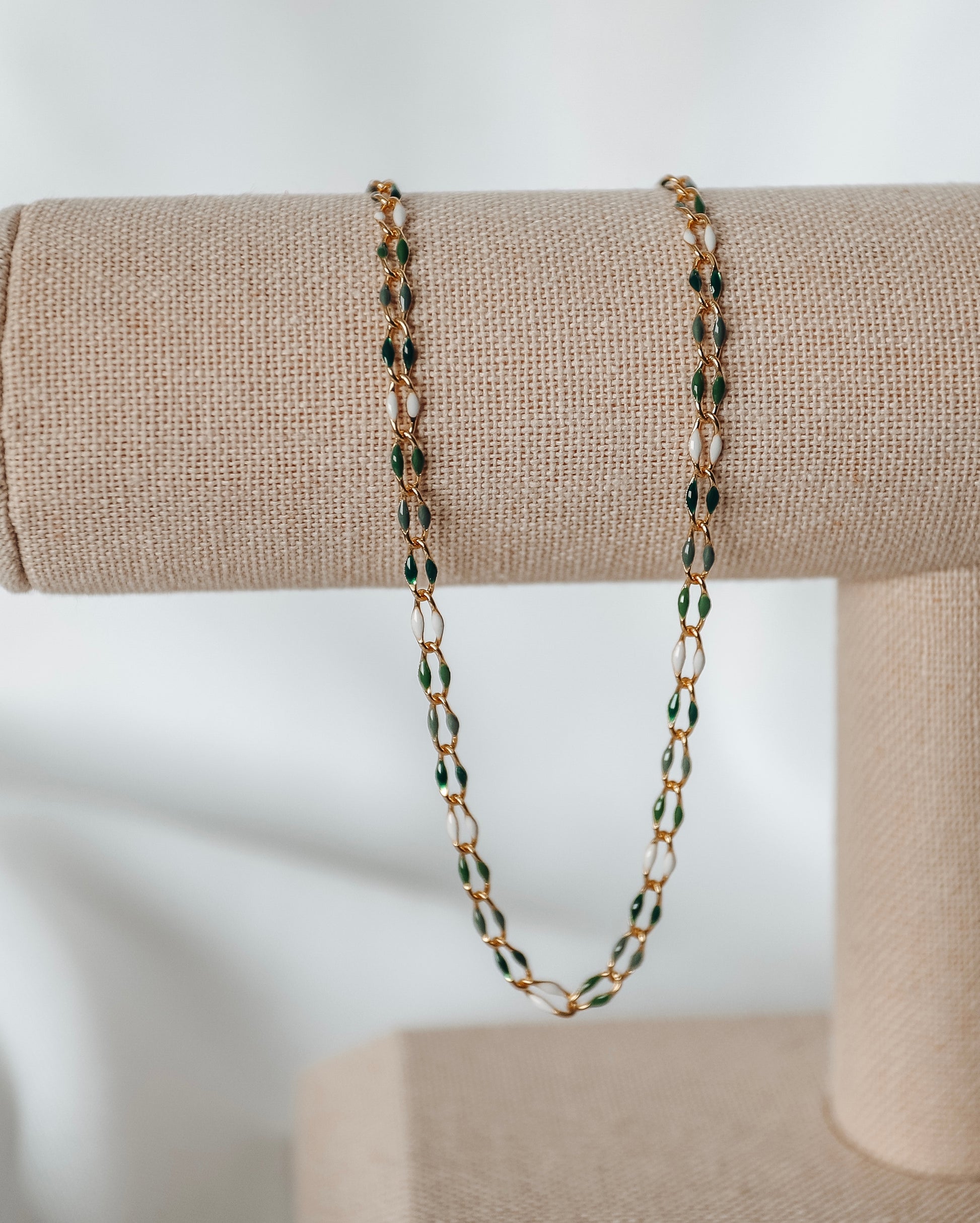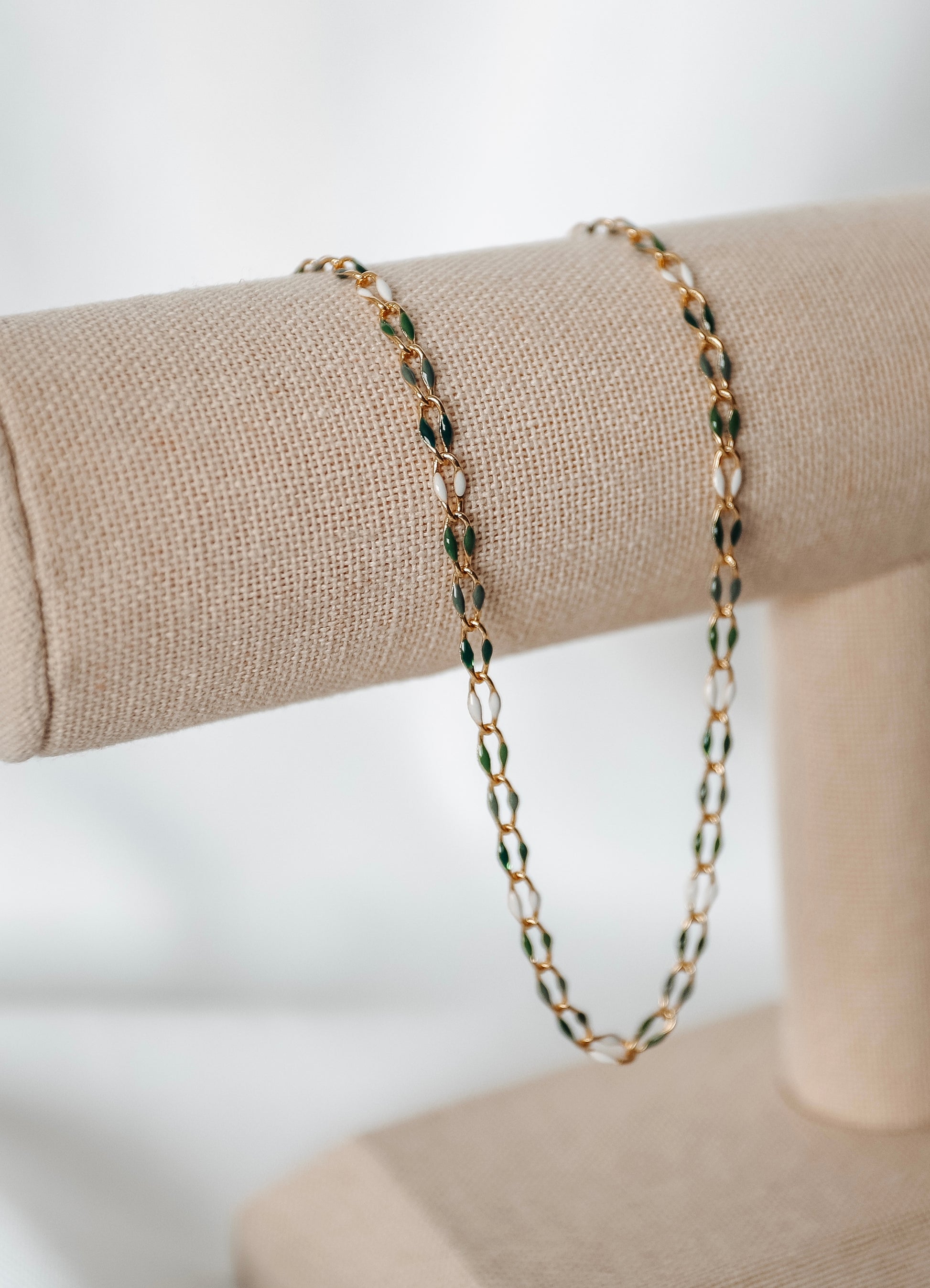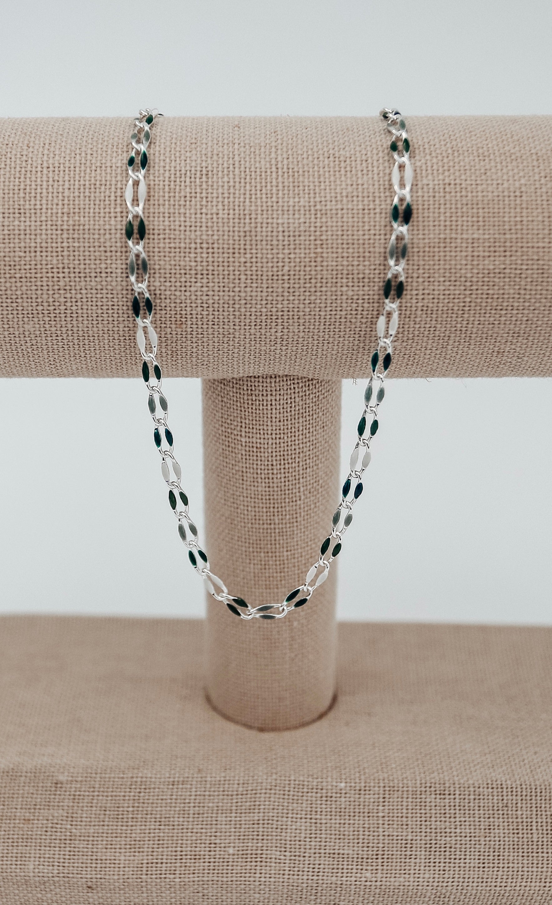 Evergreen enamel coats gold/silver plated links in a deep pine color perfect for winter or nature‑inspired lines. Sold by the foot.