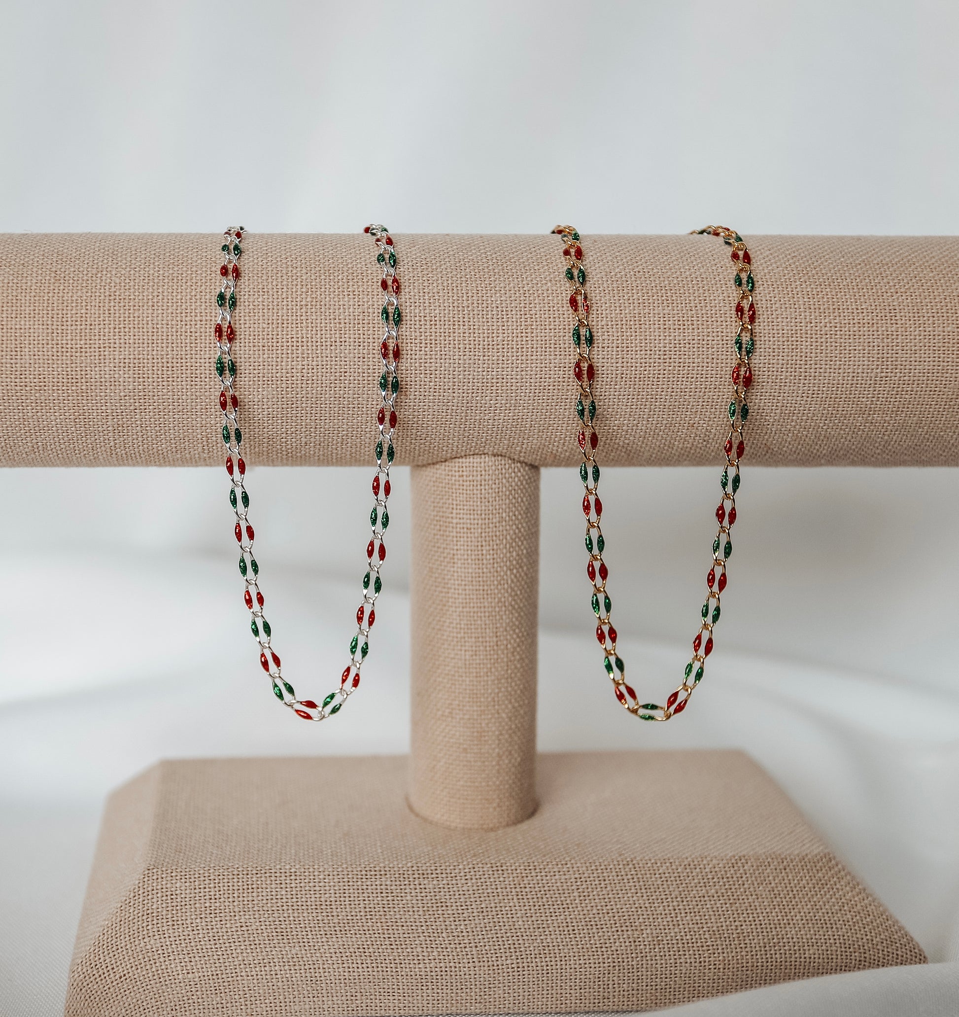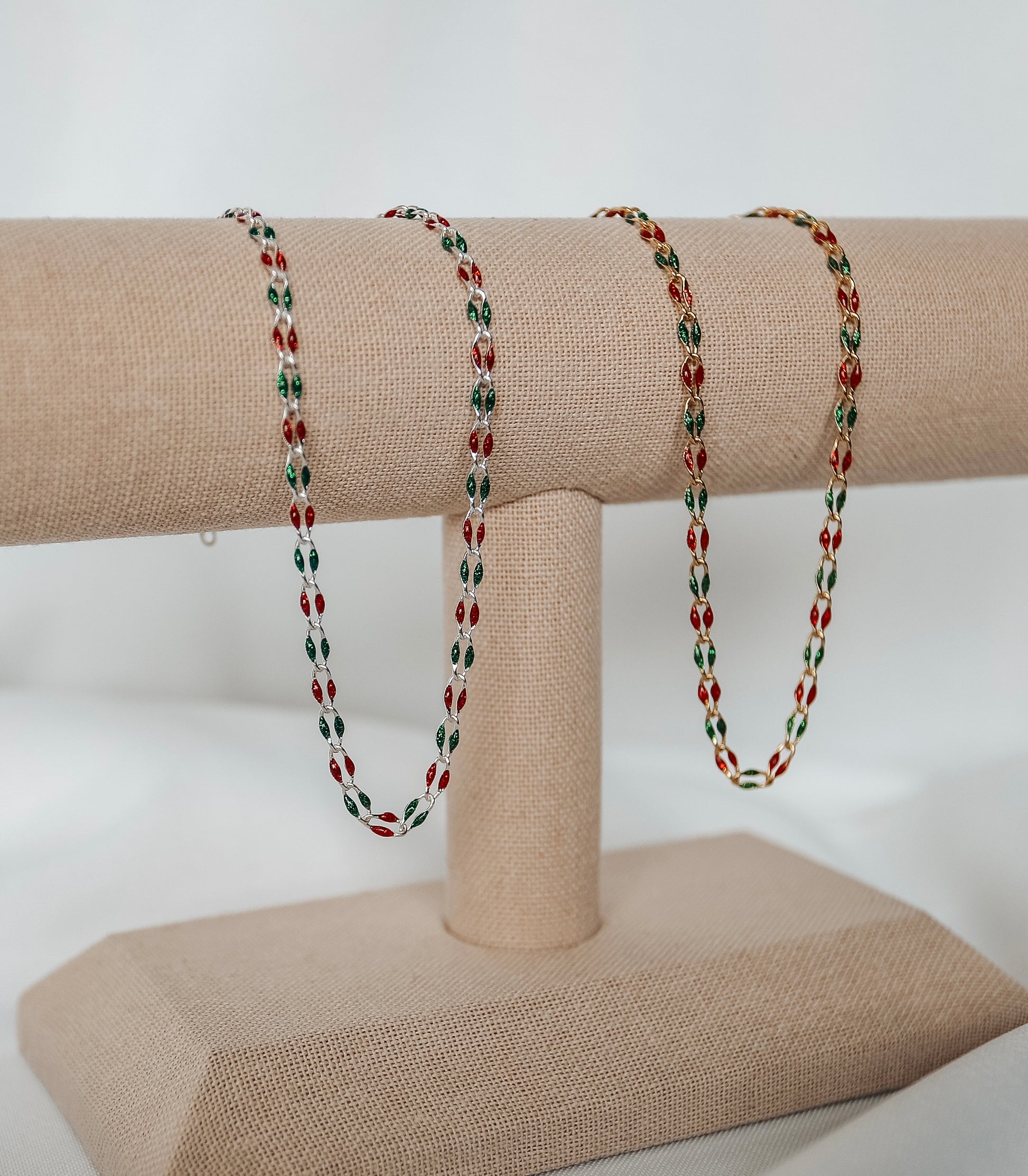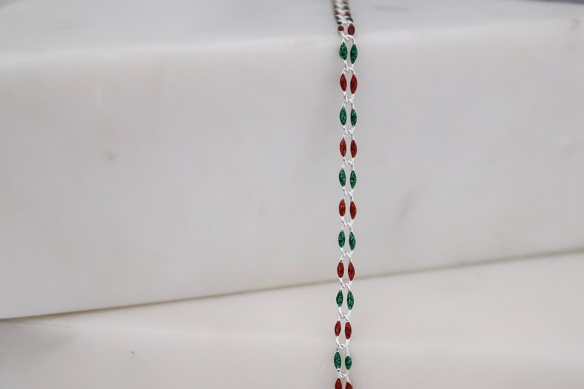 Holiday‑inspired ‘Merry & Bright’ chain layers red and green glitter enamel over gold/silver plated links.