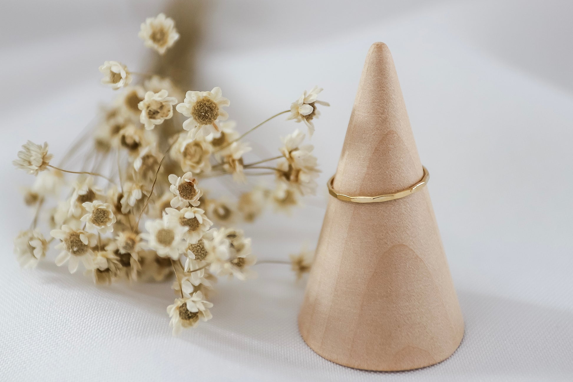 This hand-hammered ring is made from gold-filled or sterling silver with a 1.4–1.5 mm band. It's thin enough for stacking but strong enough for everyday wear. Each ring is work-hardened for added durability. The textured surface helps hide small scratches, making it a great option for simple wedding bands or everyday styles.