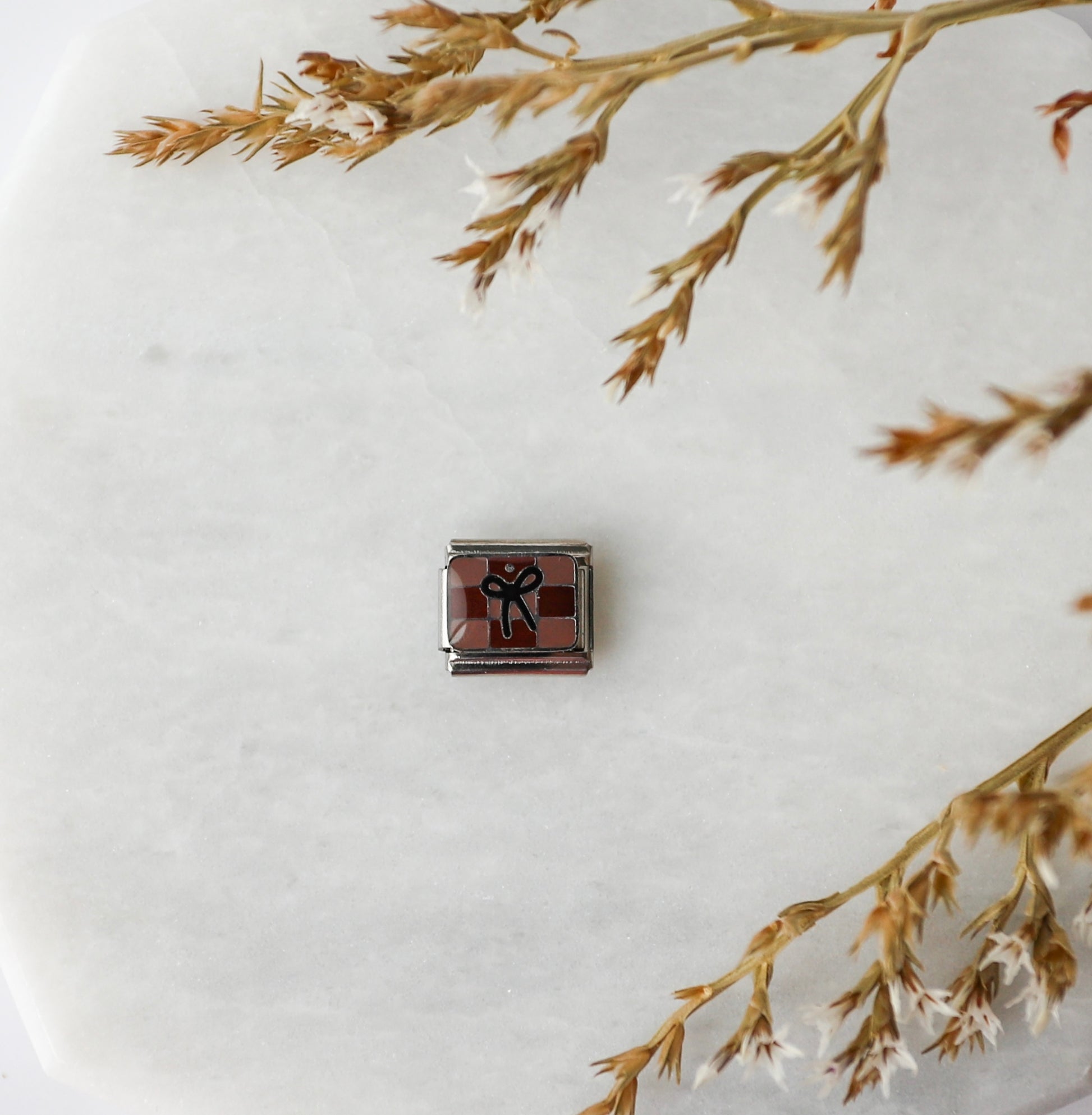Add a cozy, stylish touch to any bracelet with this plaid bow charm. Featuring a deep pink checkered pattern with a delicate black bow overlay, this piece brings a trendy, slightly preppy vibe to any stack.