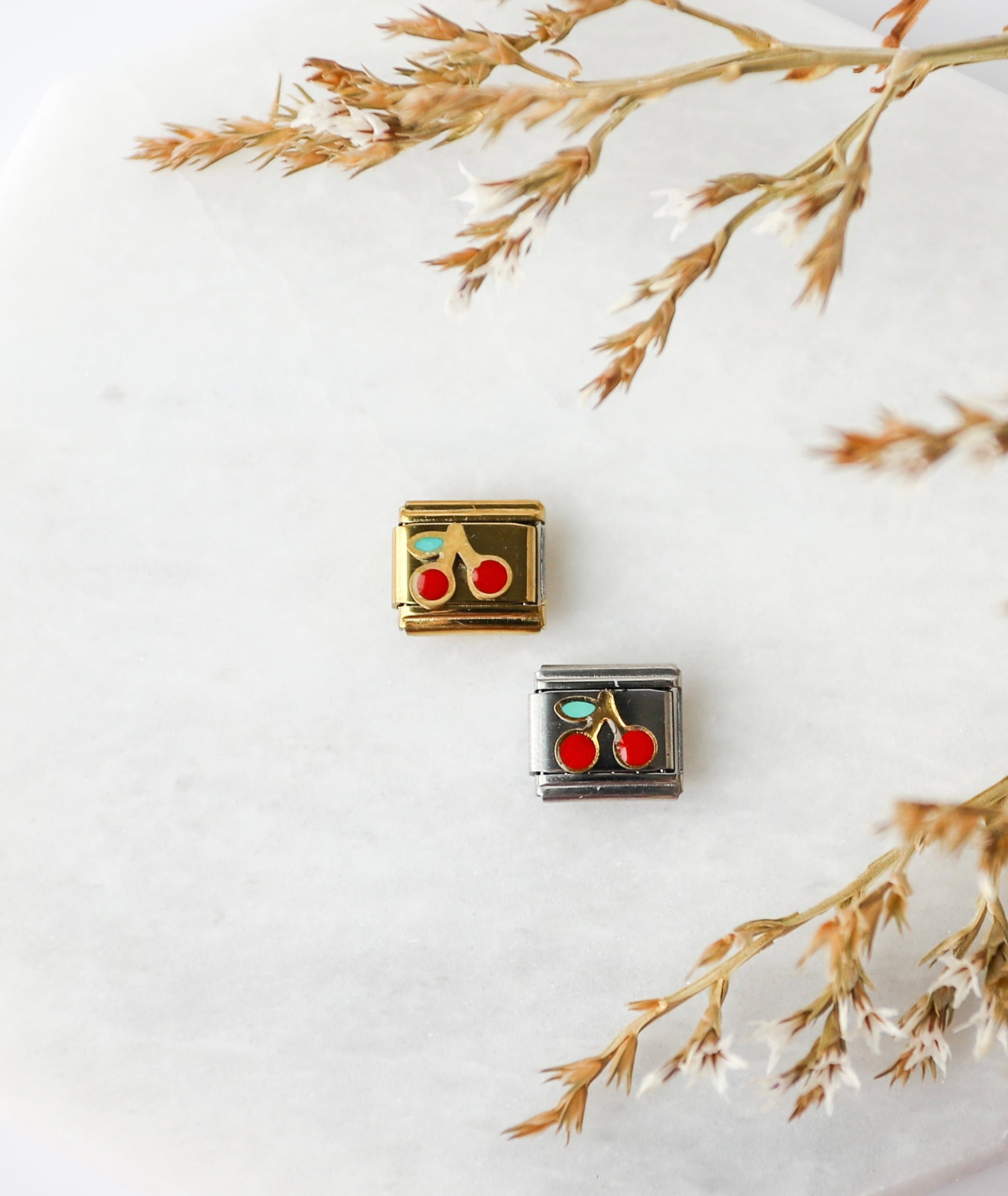 Add a sweet pop of color with this classic cherry charm. Featuring bright red cherries with a gold-tone stem and a touch of green, this piece brings a fun, retro-inspired vibe to any bracelet.