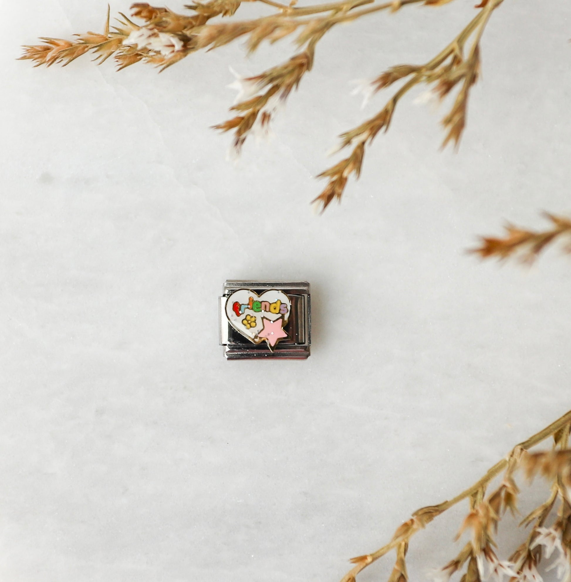 Sweet and full of personality, this “Friends” heart charm features colorful lettering with playful details like flowers, stars, and subtle sparkle accents. It’s the perfect piece to celebrate friendship and meaningful connections.