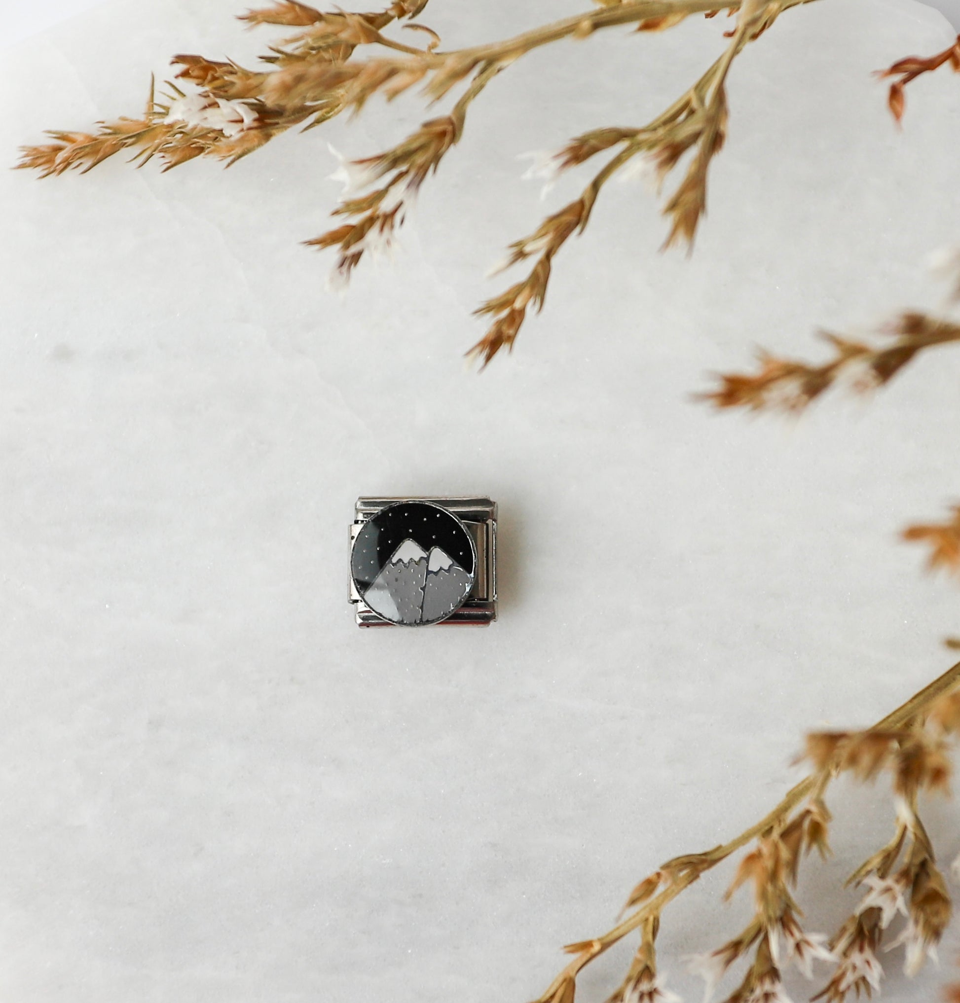 Moody and minimal, this night mountain charm features a sleek grayscale landscape with snow-capped peaks under a starry sky. Its neutral tones make it easy to pair with any charm while still adding a unique, outdoors-inspired touch.