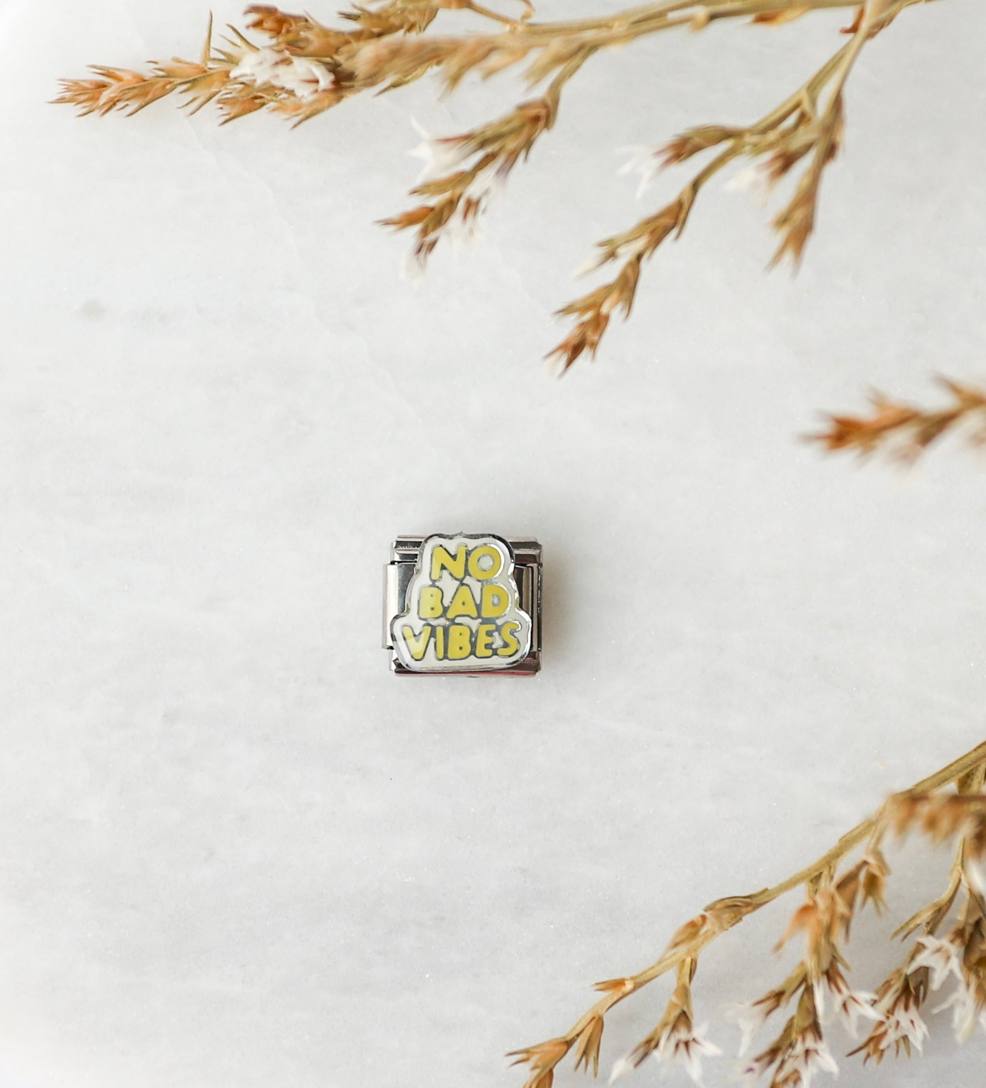 Keep it positive with this fun “No Bad Vibes” charm. Featuring bold yellowish/green lettering on a clean white background, this piece brings a playful, uplifting energy to any bracelet.