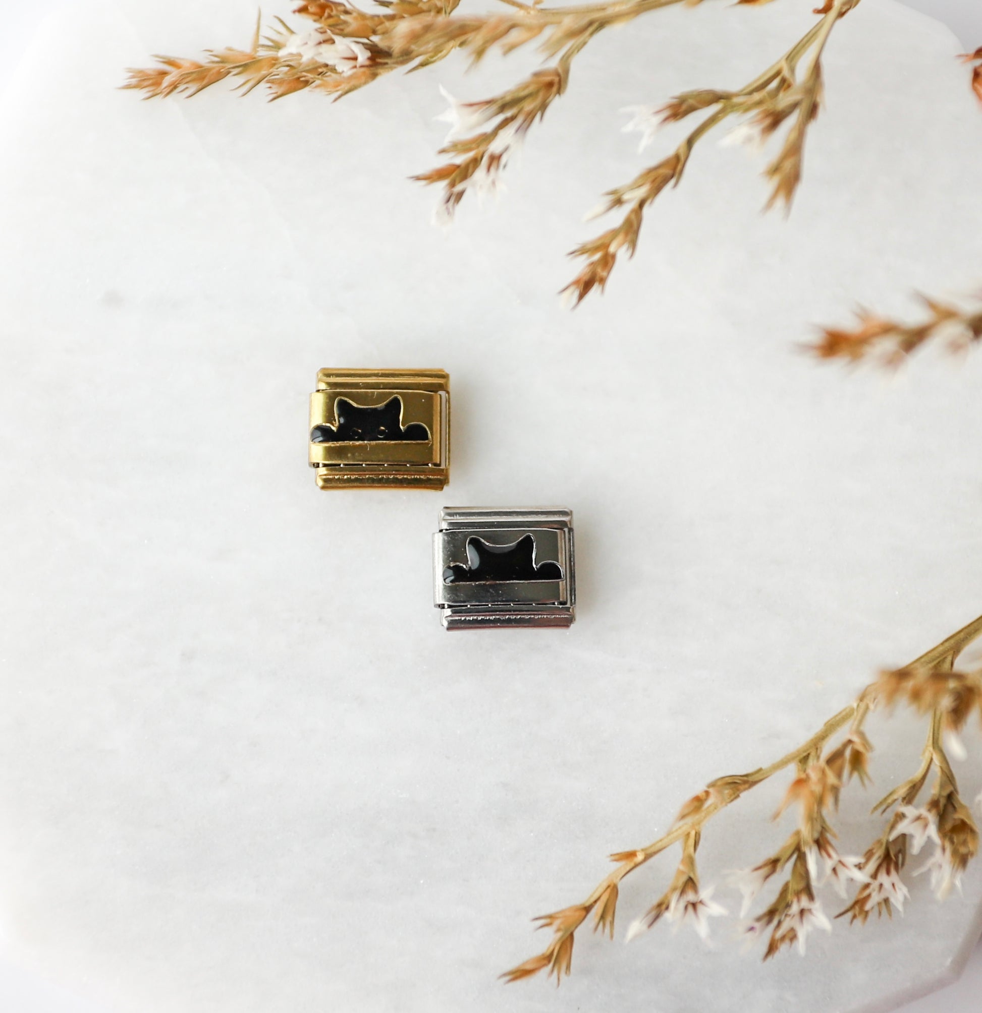 Add a subtle and playful touch to any charm bracelet with this peeking cat silhouette design. Featuring a minimalist outline of a peeking cat’s face against a sleek metal background, this charm is perfect for cat lovers who prefer a simple, modern look.