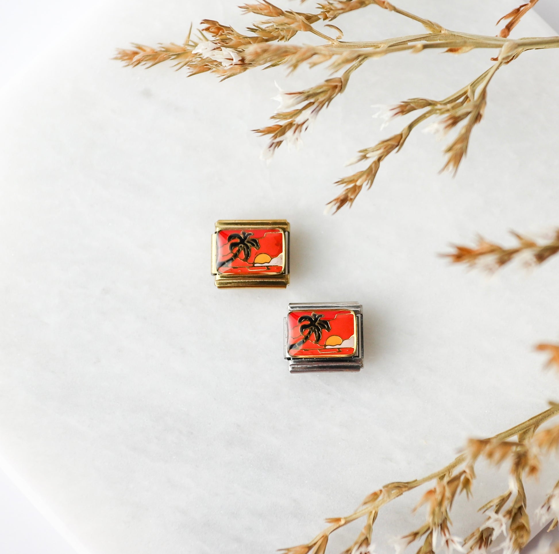 Bring the vacation vibes wherever you go with this tropical sunset charm. Featuring a palm tree silhouette against a warm orange sky and setting sun, this piece captures the feeling of beach days and summer nights.