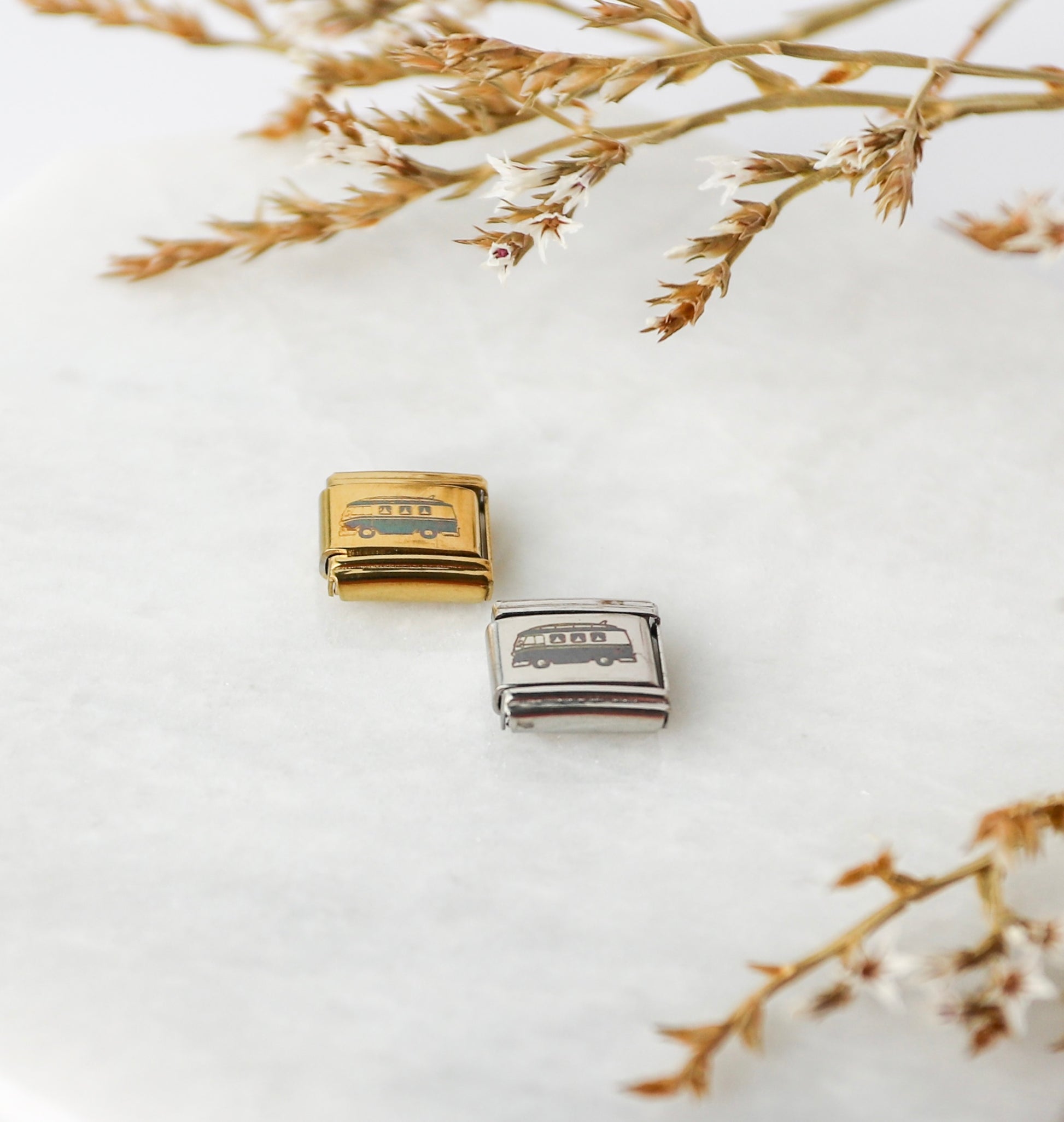 Add a laid-back, adventurous touch to any charm bracelet with this vintage van design. Featuring an engraved-style illustration on a sleek metal background, this charm brings a classic, minimalist look with a nod to travel and free-spirited style.