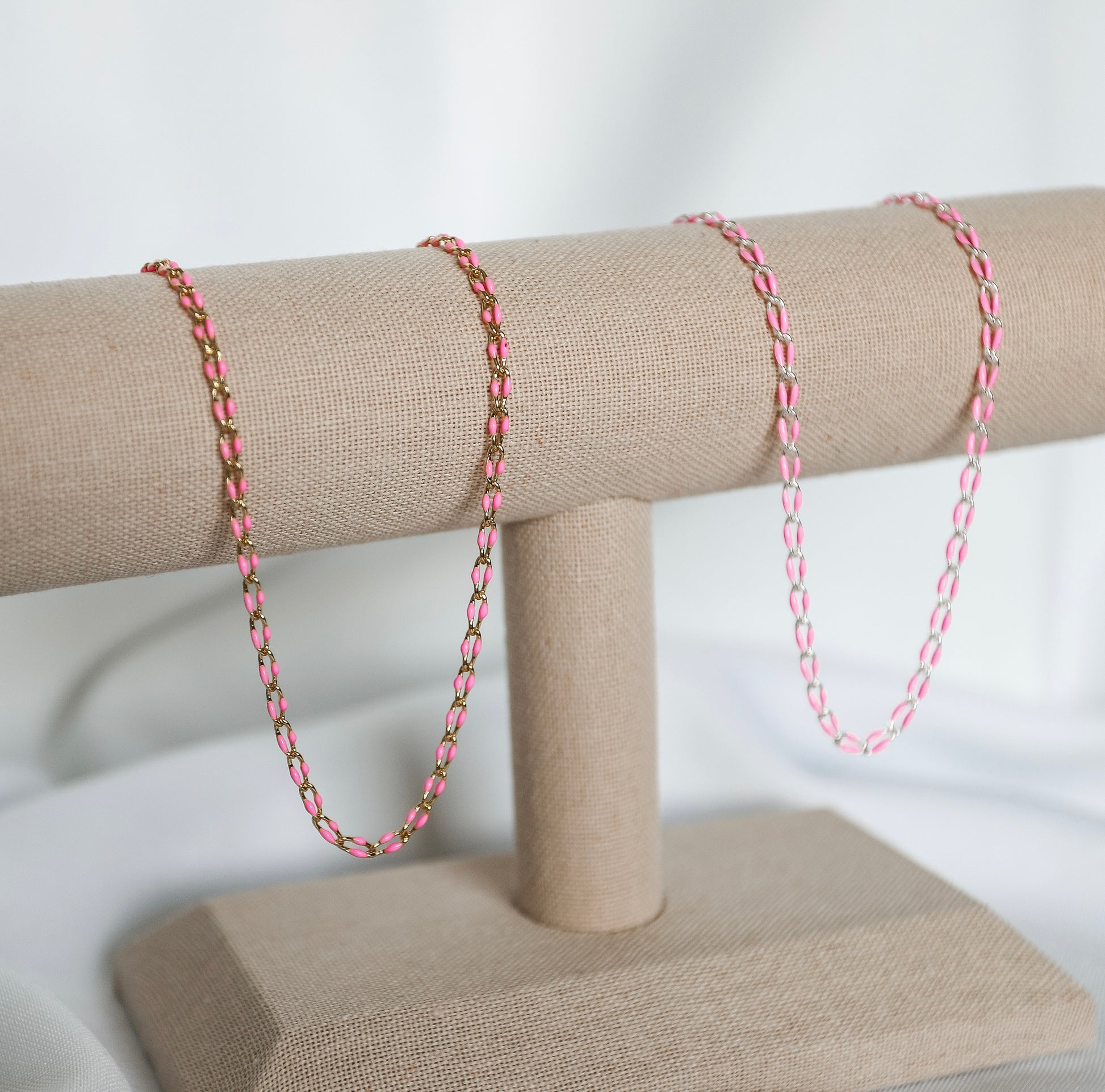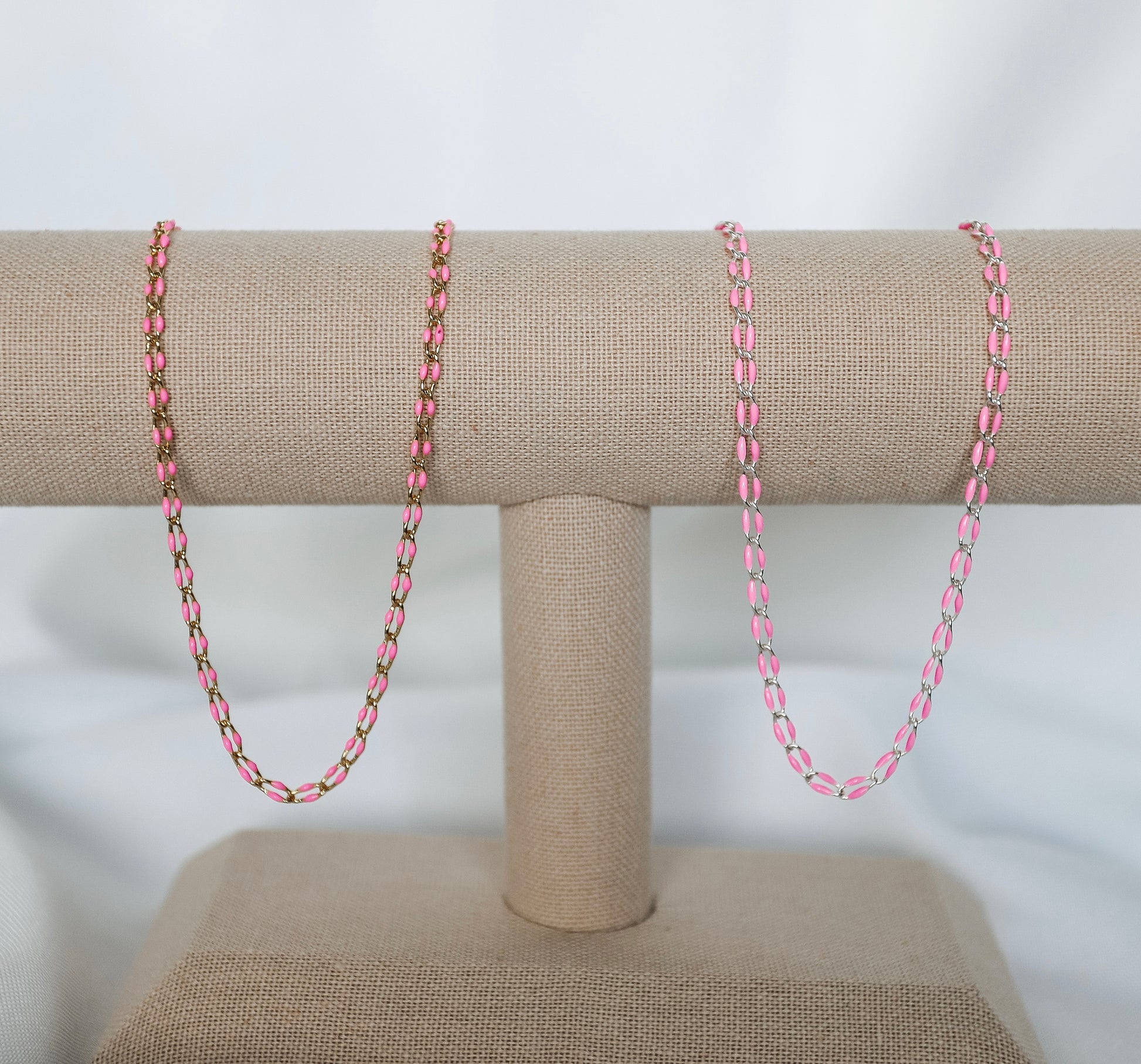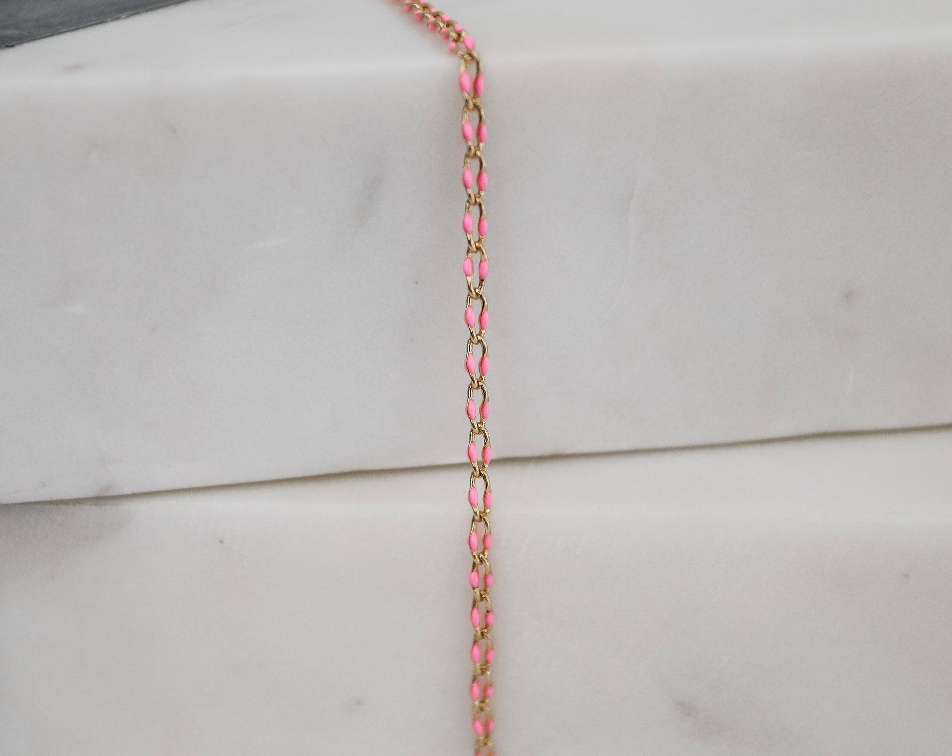 This gold/silver plated chain features a light-pink enamel coating that gives it a soft, blush look great for spring or bridal jewelry. It’s sold by the foot and bends easily for use in bracelets or layered necklaces.