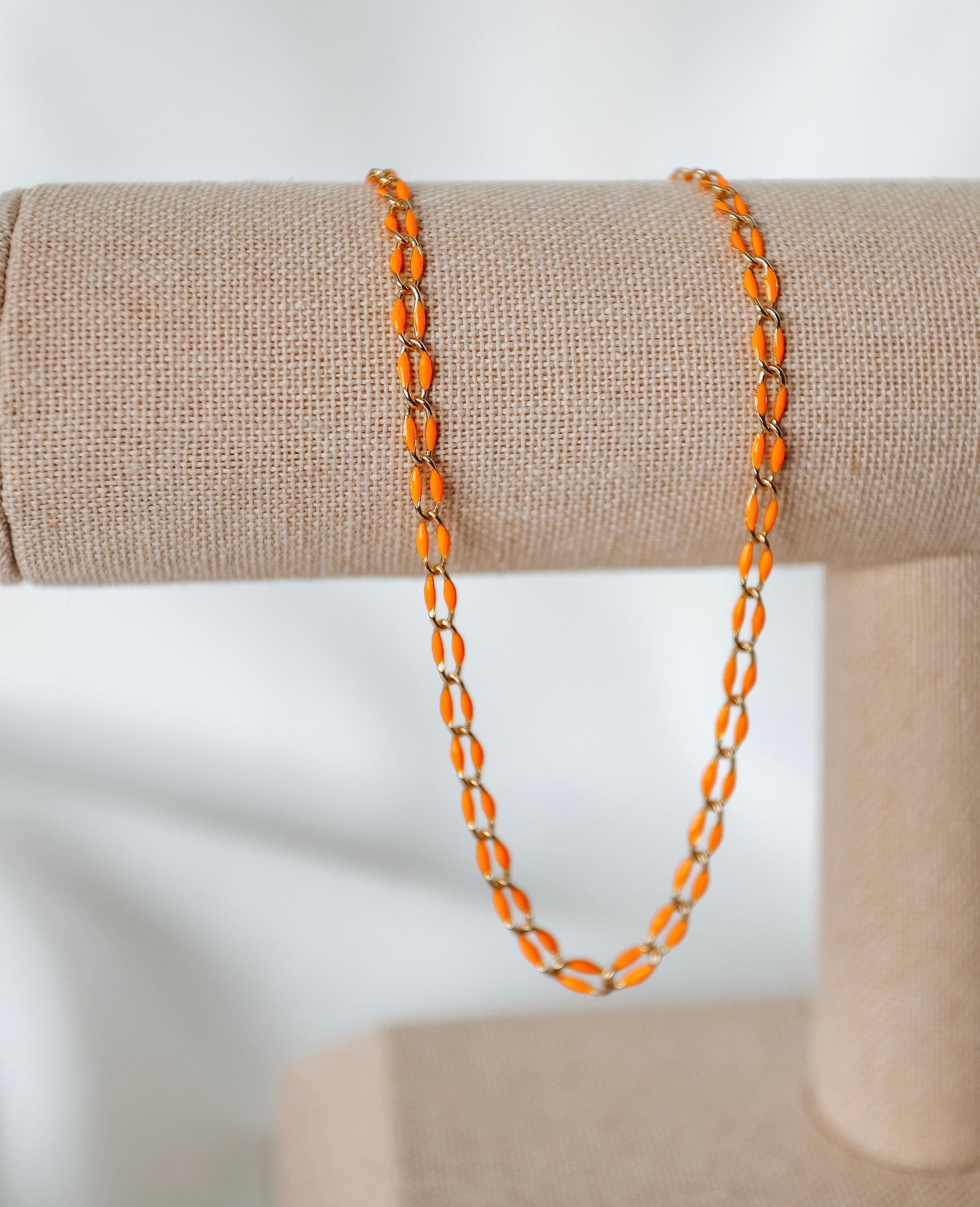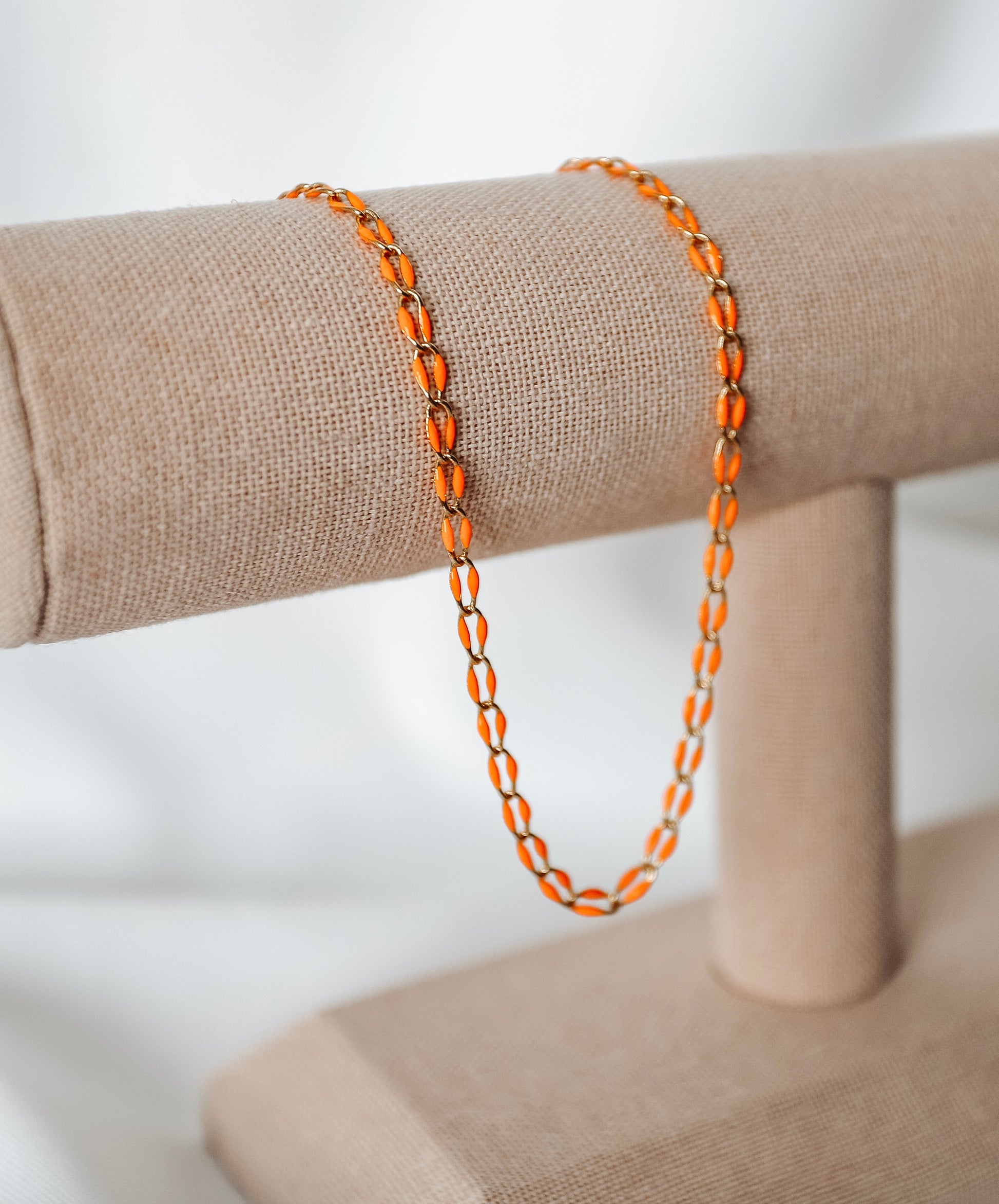 Bright orange enamel coats gold or silver-plated links for a bold single‑color chain. Sold by the foot, it trims cleanly for festival bracelets or accent necklaces. A fast way to add color without separate connectors.