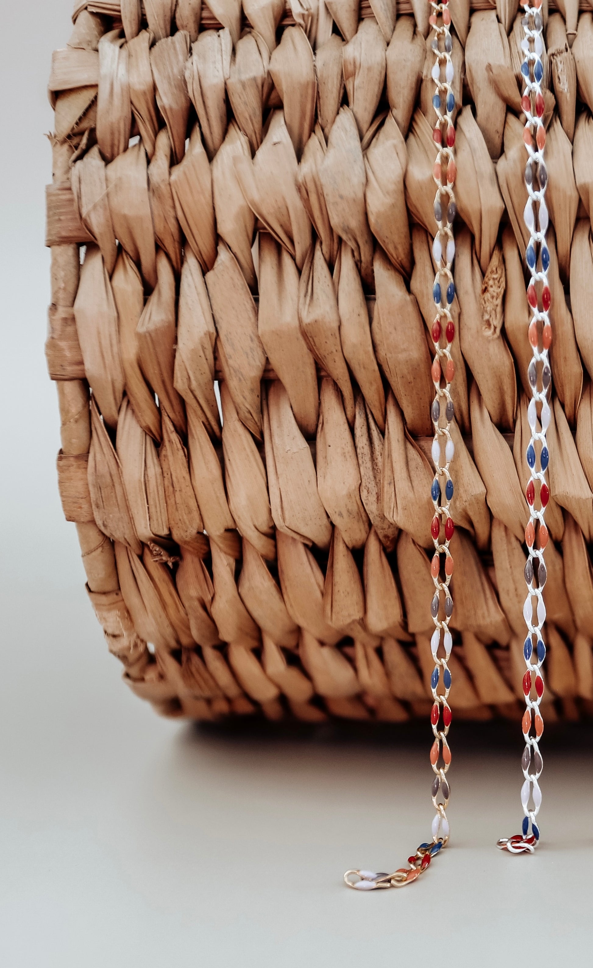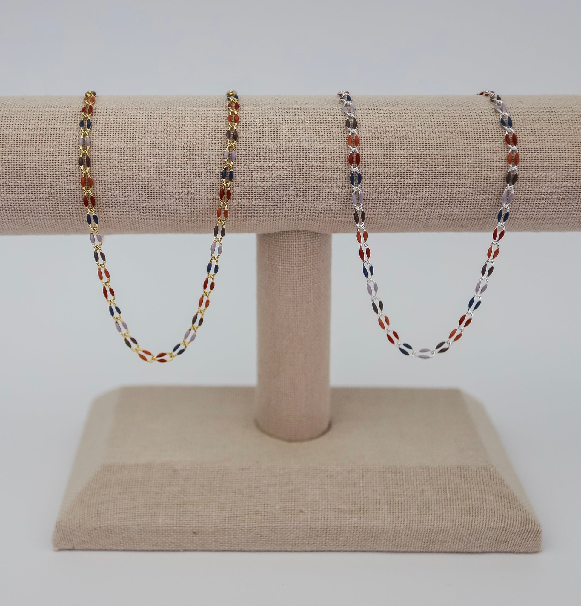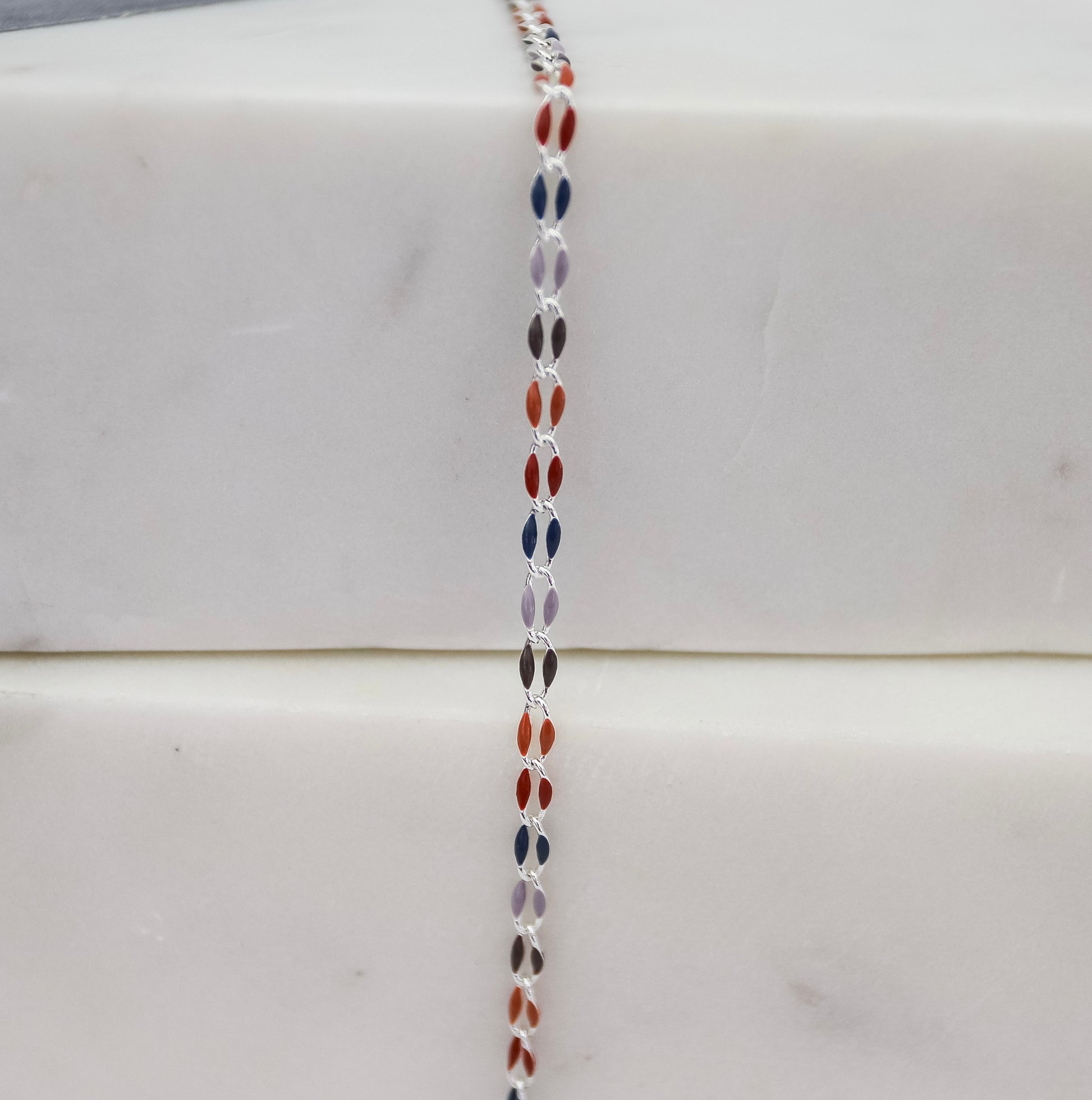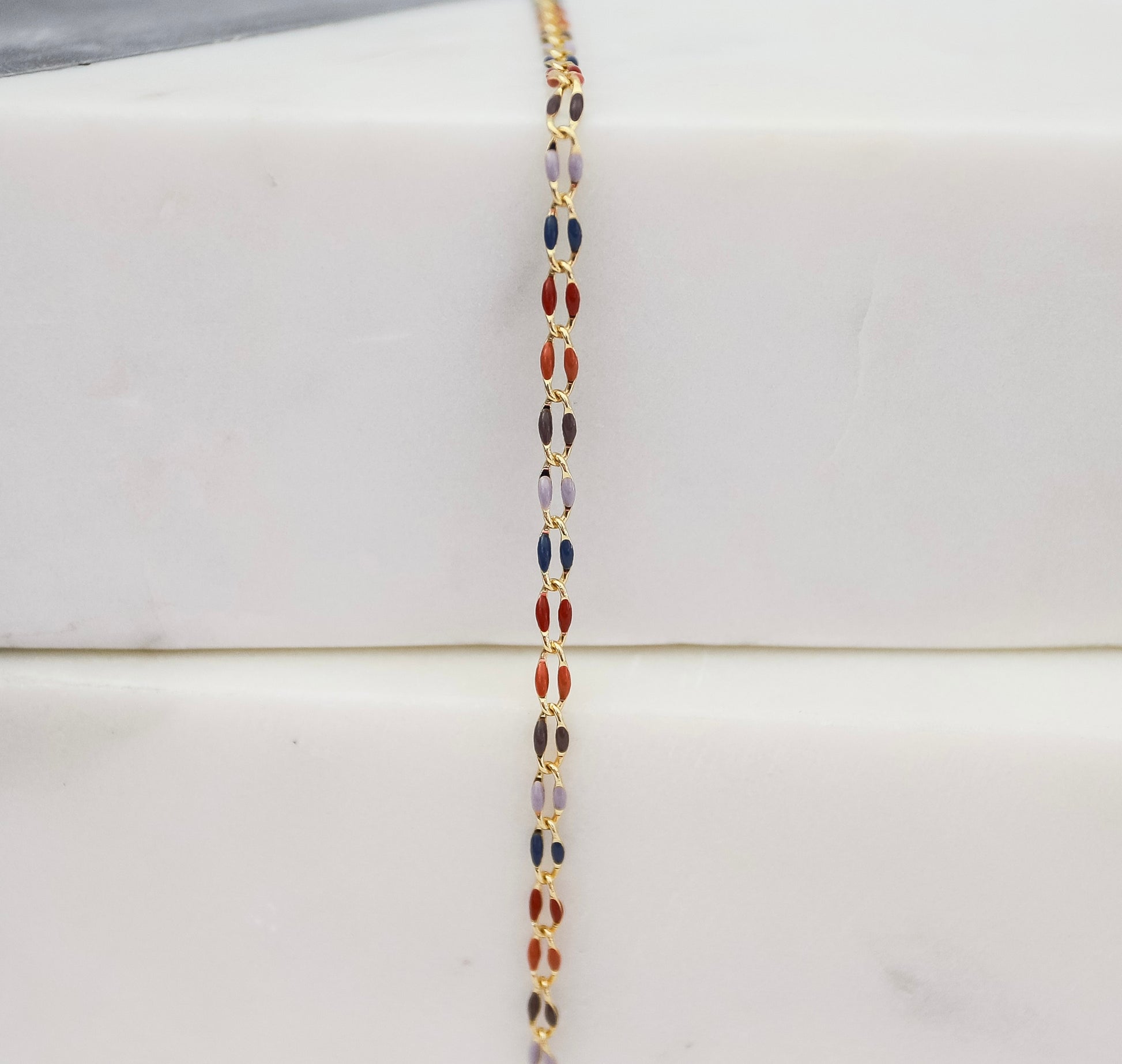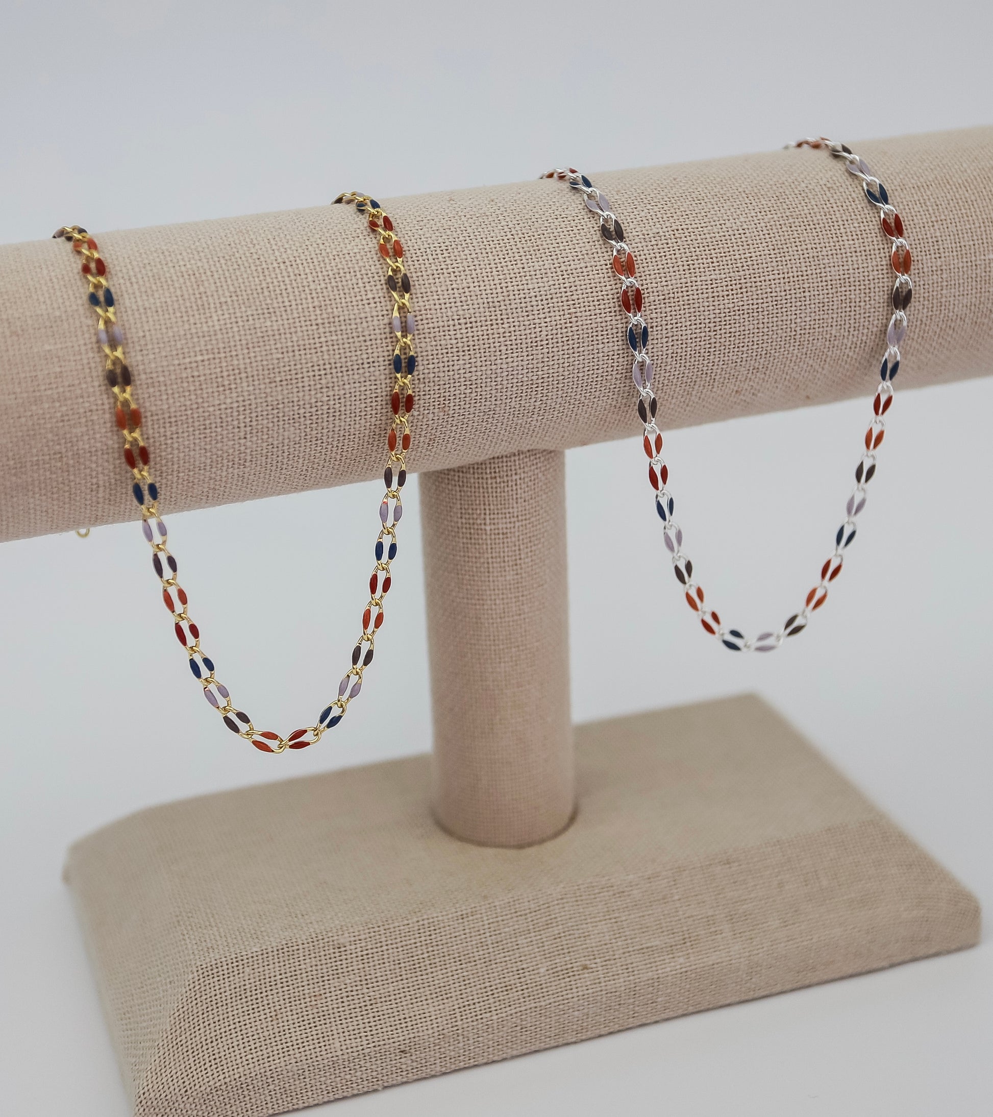 This seasonal chain coats gold plated or silver plated links in a cozy mix of fall colored enamel. Sold by the foot, the chain cuts easily for bracelets, anklets, or layered necklaces.