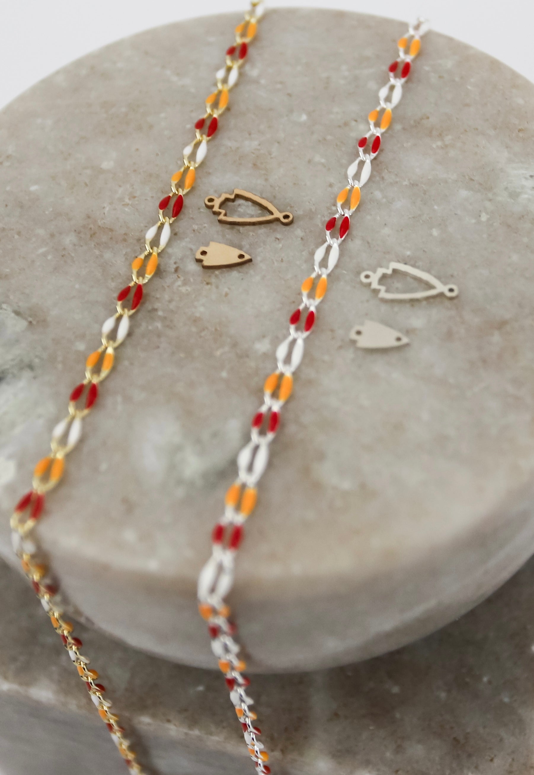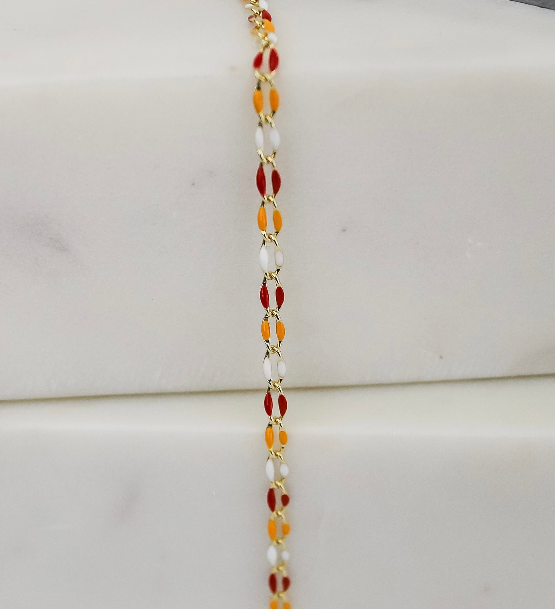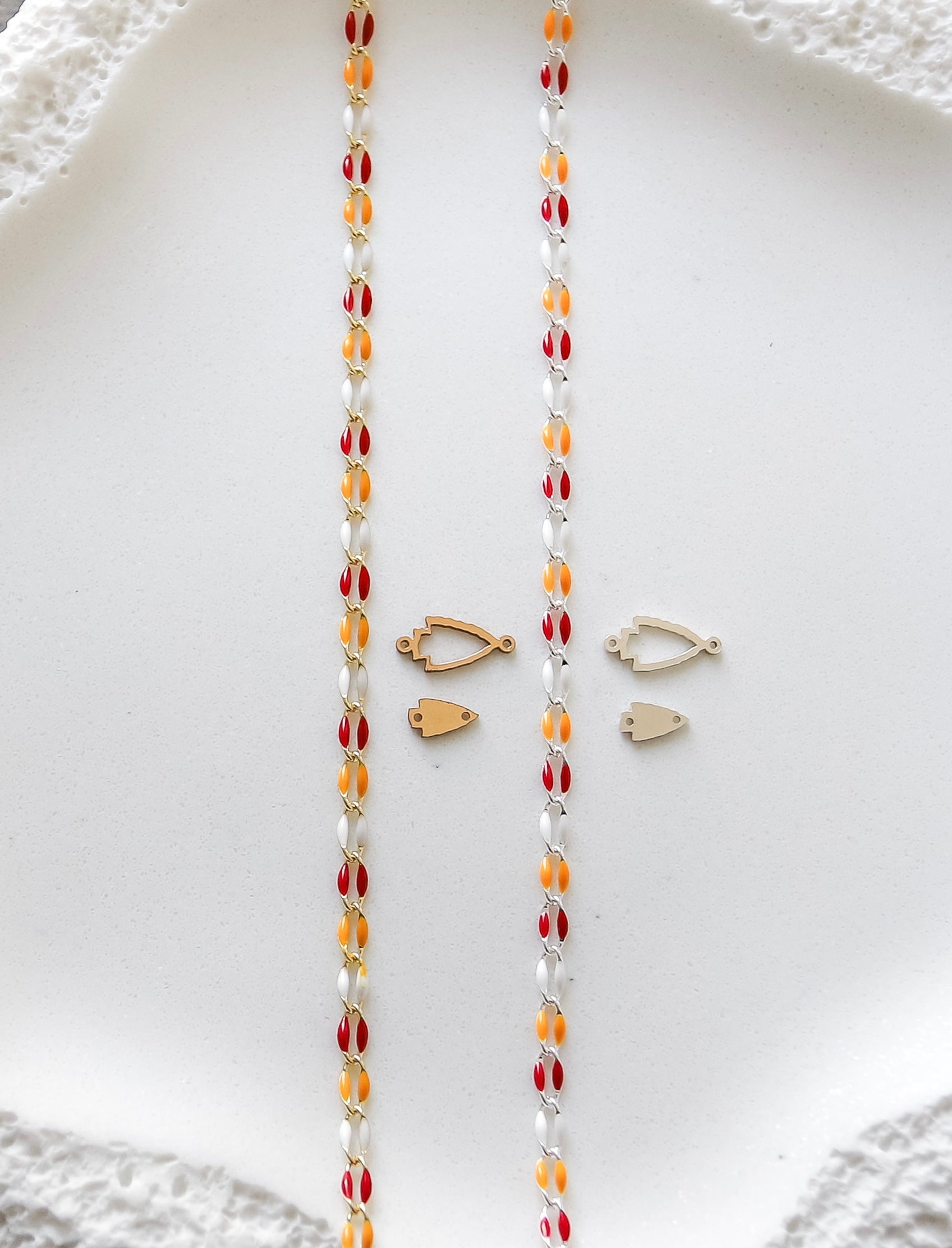 This plated chain carries alternating stripes of white, red, and yellow enamel over a gold plated base. Pair this chain with my arrowhead connectors!