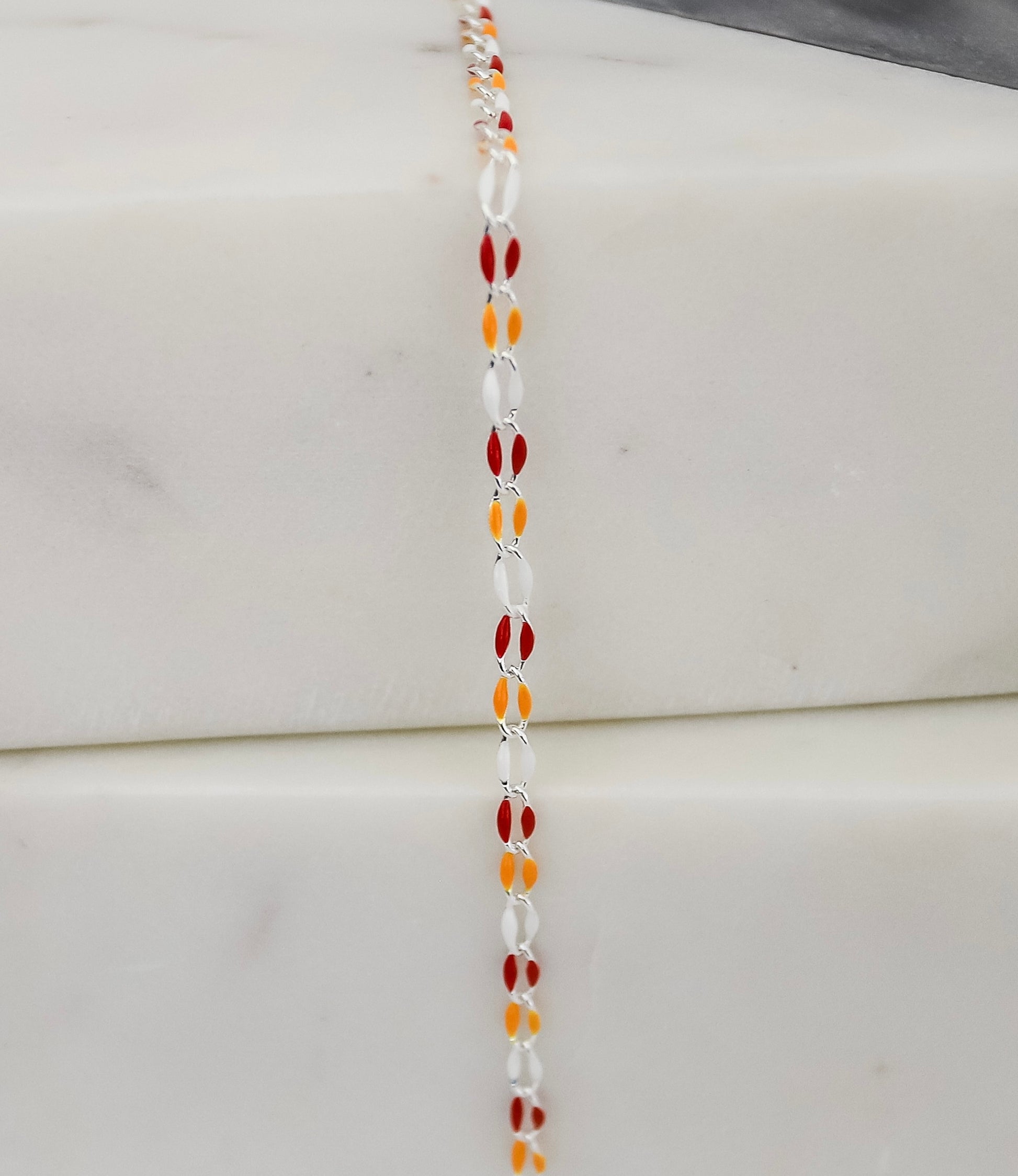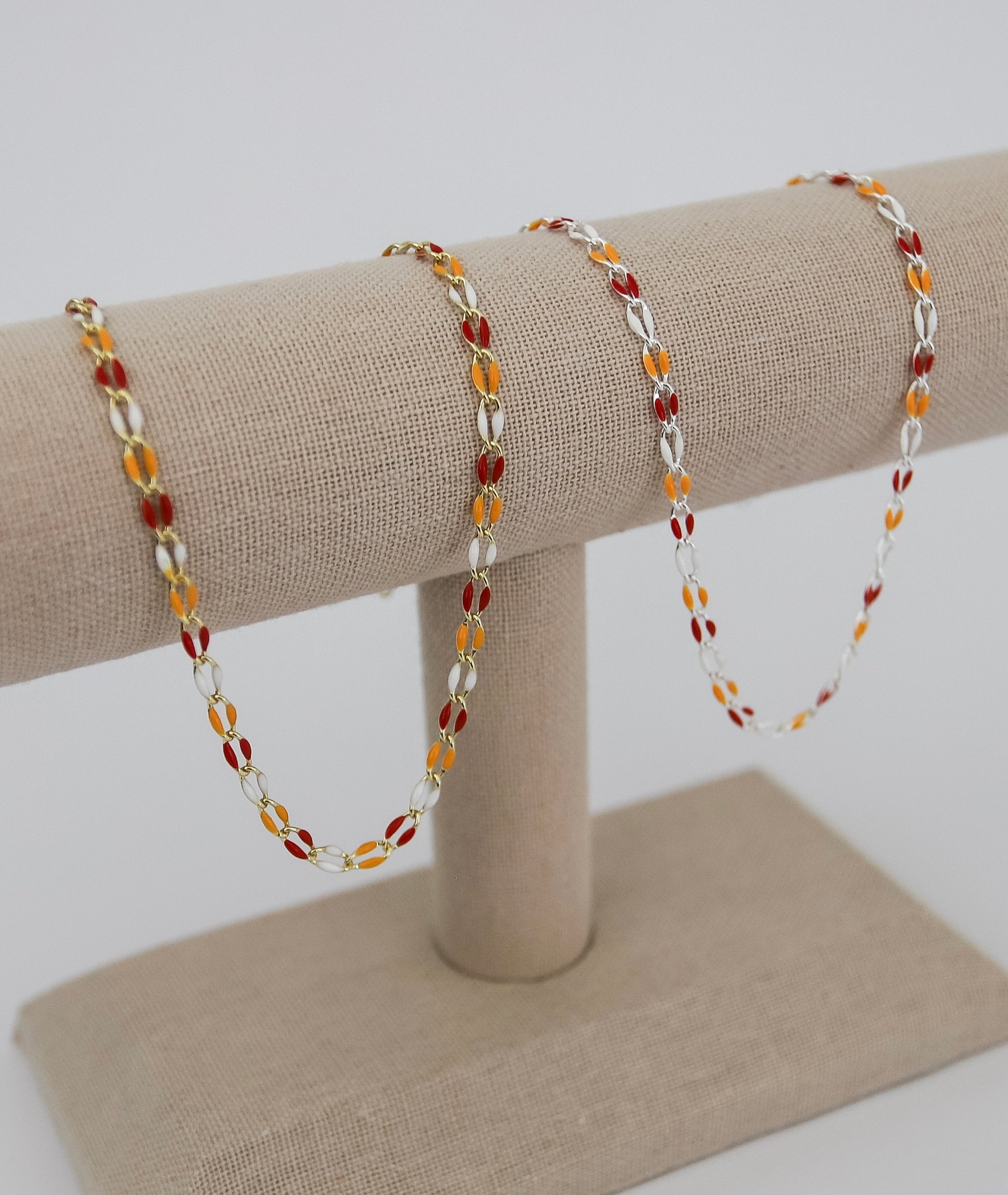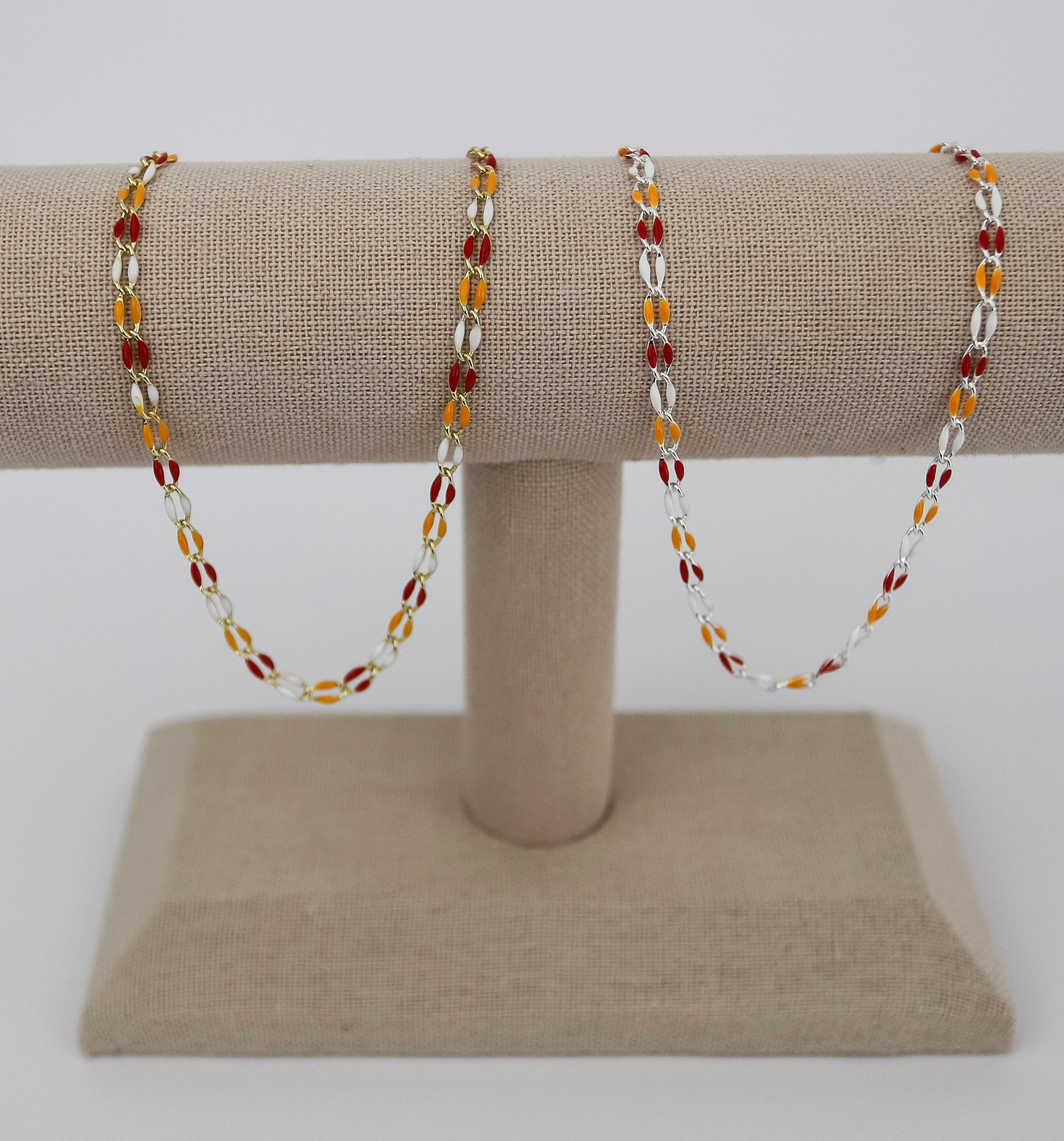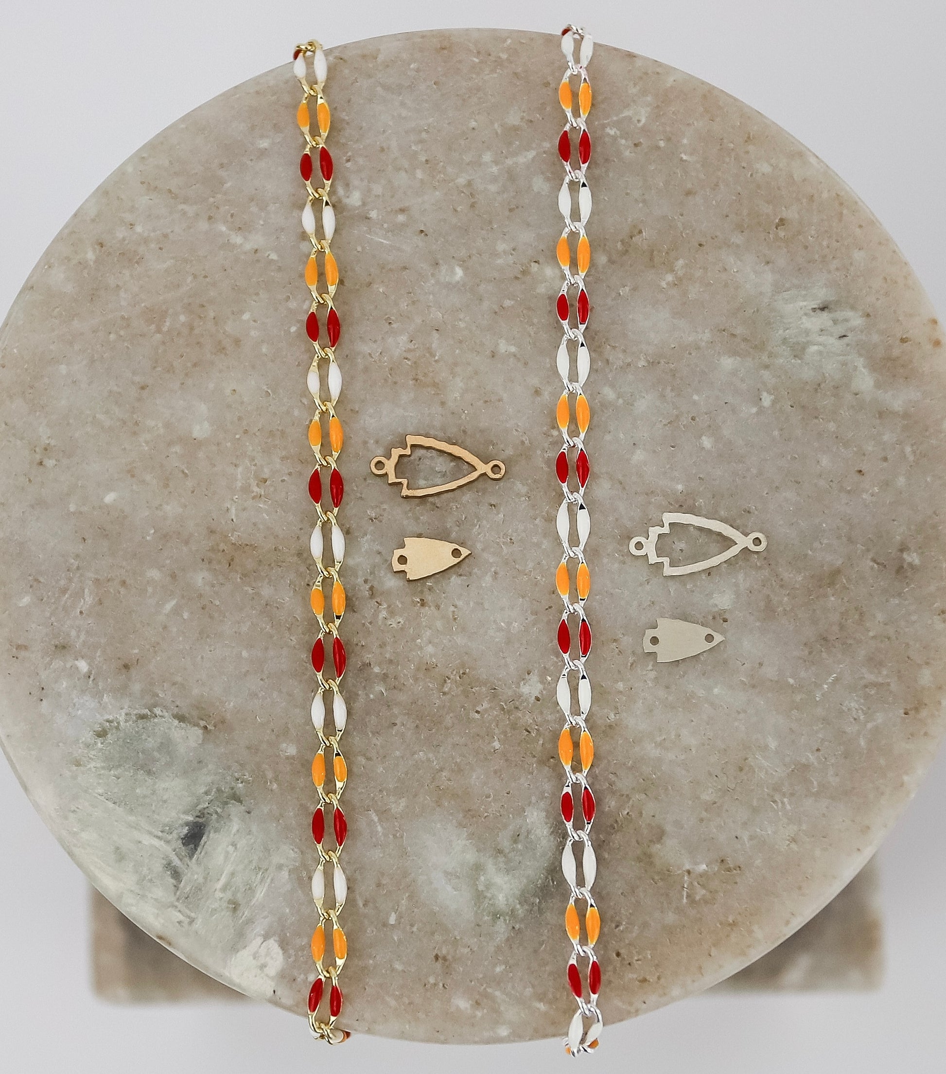 This plated chain carries alternating stripes of white, red, and yellow enamel over a gold plated base. Pair this chain with my arrowhead connectors!